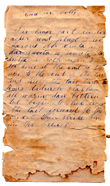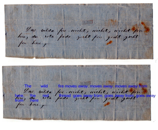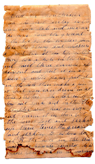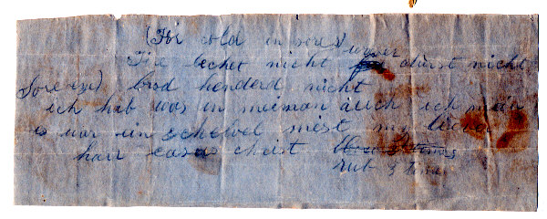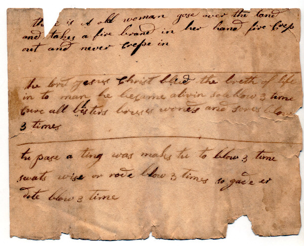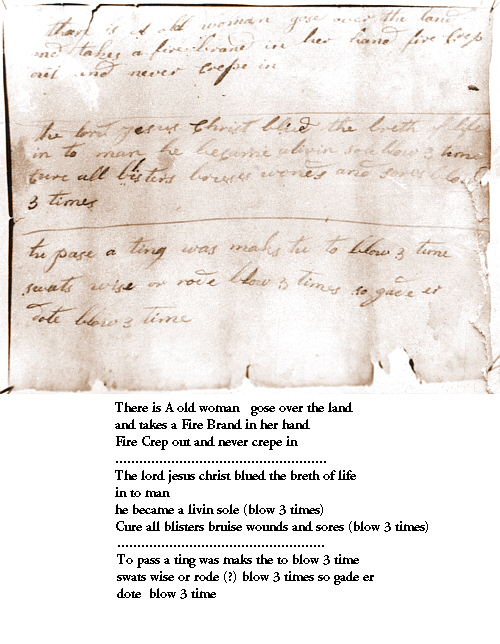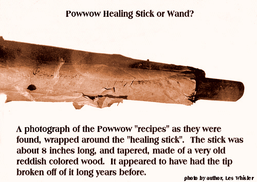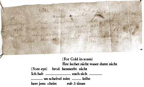 Powwow Medicine and the Tawzers The artifacts documented here, were used by Barbara Thomas Tawzer and her husband Jeremiah Brumbaugh Tawzer, for healing purposes. Barbara was a well-known healer in Woodford Co. Illinois, after they moved here from Adams/Cumberland County, Pennsylvania. They were German Anabaptists, (Dunkards) and later became known as The Brethren. My grand mother well remembered Barbara holding healing sessions in their home in Roanoke, and Jeremiah, (her grandparents) assisting in these sessions. She said that people would travel by horse and buggy to arrive at the homestead for healing. She remembered the prayerful, solemn attitudes of those in attendance, and the soft voice of her grandmother as she spoke the words of the ceremonies and blew across the "healing stick" at certain times during the sessions. The healing was not limited to human, but also included the healing of animal life. Jeremiah corresponded with other healers exchanging information. A reply to one such letter has, what I take to be cabalistic symbols, written in a double-sized script at the top of the letter, followed by the words, "I hope this proves good". Some of the "recipes" are in english, some in Penns Deutch, and others that are much older and on a thicker parchment-like paper and are in a very old form of German. I sent copies of these to be examined by specialists in German and have partial translations, and the opinion that they are similar to phrases in artifacts of German Paganism from the Middle Ages. The paper "Vilda Fire" was said to be a "cure for cancers" through my families' traditions, however, its origins seem to be possibly connected to the "Black Plague" in Europe. The Brethren (Dunkard, Tunkers, Tauffers) were German Anabaptists who were more mystical in their religion than other of the Anabaptist movement, (Amish, Mennonite, etc) In this type of healing you notice a blending of Christian thought with a much older mystical religious thought. Truly, there is an element of the old "earth religions" here. Barbara's daughter Martha Switzer was embarrassed by her mother's "old-fashioned" ideas and reputation as a healer, so when her mother passed away, Martha wallpapered all the evidence of her mother's practices inside a small handmade trunk of hers, but before she died, made its contents known to her daughter, Erma Switzer Wiley. Then when Erma was in old age she passed the trunk on to her daughter, Joyce Wiley Whisler (my mother). Mom opened the trunk in my presence, and all of the bits of paper with the verses were wrapped around the "healing stick" in the manner of a scroll, and the outside labeled "Powwow Recipes". My mother framed all of the artifacts and letters in a large frame, for display, being very aware of the importance of this ancient tradition. L.W. |