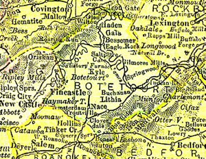 Boutetourt Co.Virginia was the area that the Henry Whistler family called home for 3 generations.. This is the Blue Ridge Mountain area of Virginia. Henry left Virginia, moving to Wayne Co. Ind. where his first two children were born. They moved then to Udell, Iowa, where my line stayed until 1926. At that time M.A. Whisler's family moved to Illinois, settling in Bricktown.. |