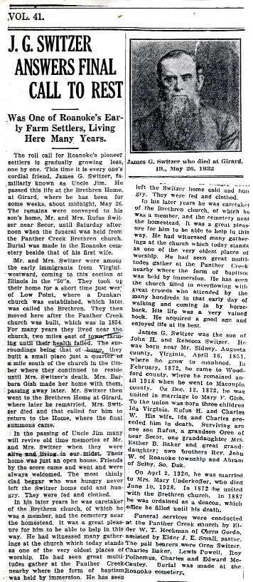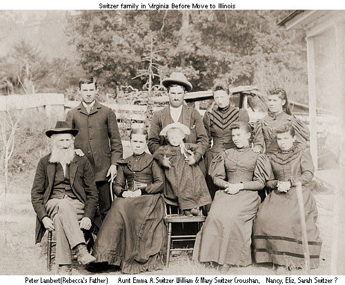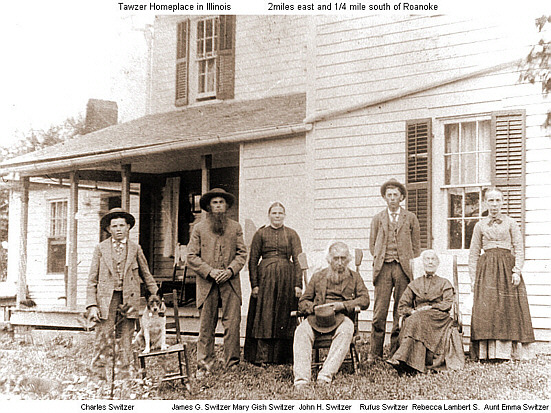 John Heffner Switzer was born in Augusta Co. VA, the 1st child of Henry and Mary Ann (Anna Maria) Haffner Schweitzer. He married Rebecca Katherine Lambert on Dec. 17, 1839. Both are buried in the Dunkard Church Cemetery at Panther Creek, NorthEast of Roanoke, IL. John fought in the civil war, driving a supply wagon. Their house was about 5 miles from the Battle of Bull Run, and the sounds of battle carried across the fields to their ears. They left Virginia coming to Woodford Co. IL by train about 1872 when John Will was 16 years of age. |