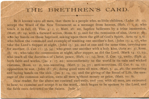 Above is a card stating the tenants of Brethren beliefs that belonged to John Will Switzer.